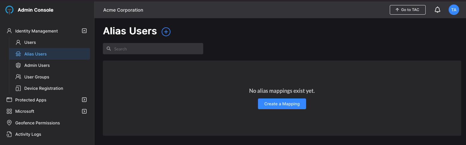 Navigate to the Alias Users menu in the TraitWare console. Click the blue button to add an alias user.