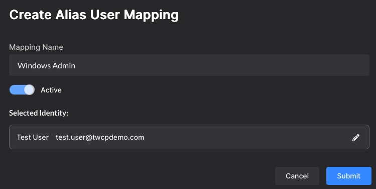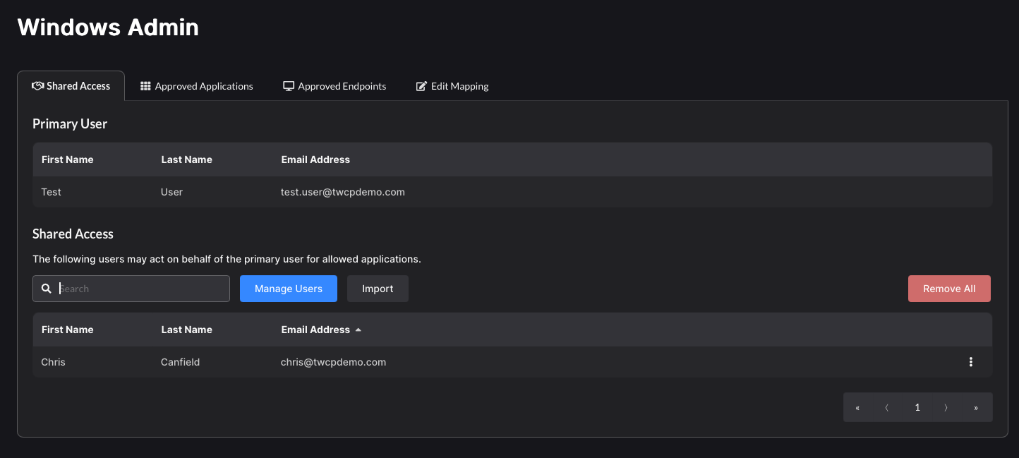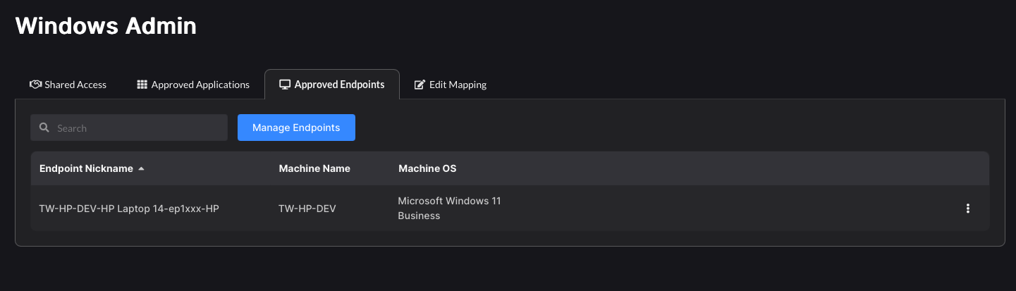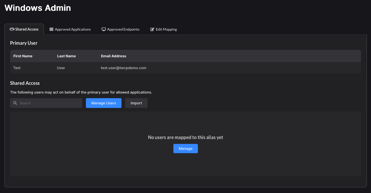 Individual Windows endpoint access may be assigned to the alias user mapping. Any user with Shared Access will be able to log into the selected Windows endpoint as the Primary user.