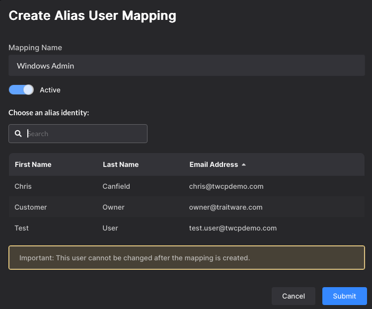 Name the alias mapping and select the Primary alias identity. This is the users others will log in as.