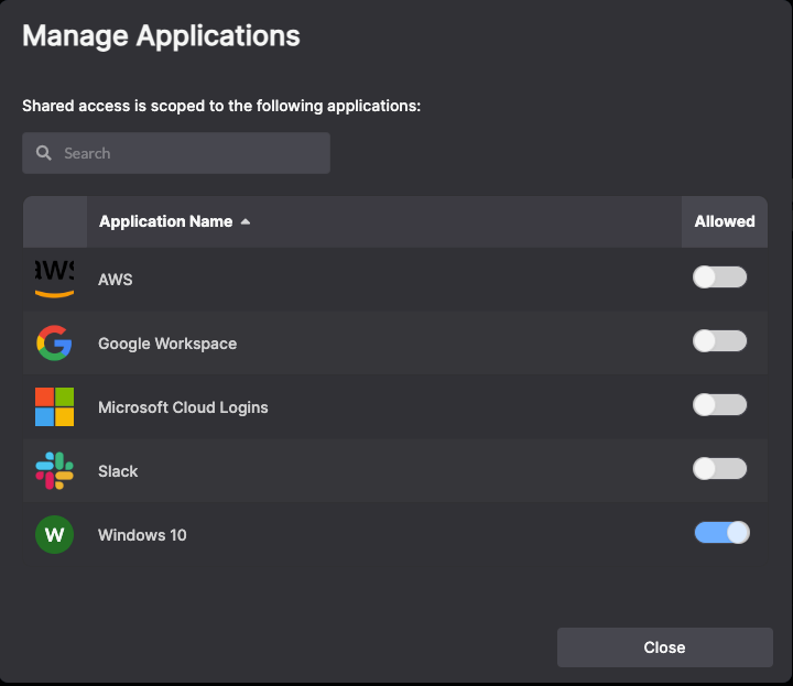Select applications to grant access to the Shared Access users.