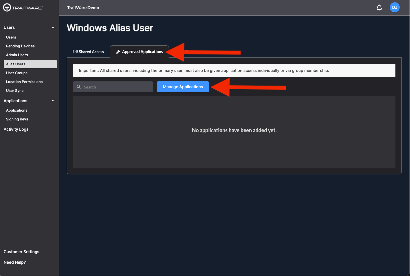 Individual application access may be assigned to the alias user mapping. Any user with Shared Access will be able to log into the selected applications as the Primary user.