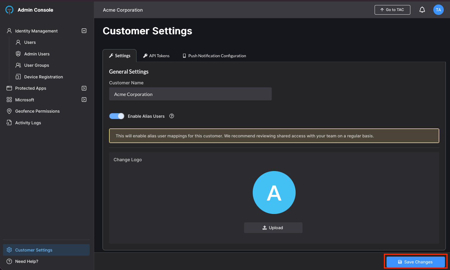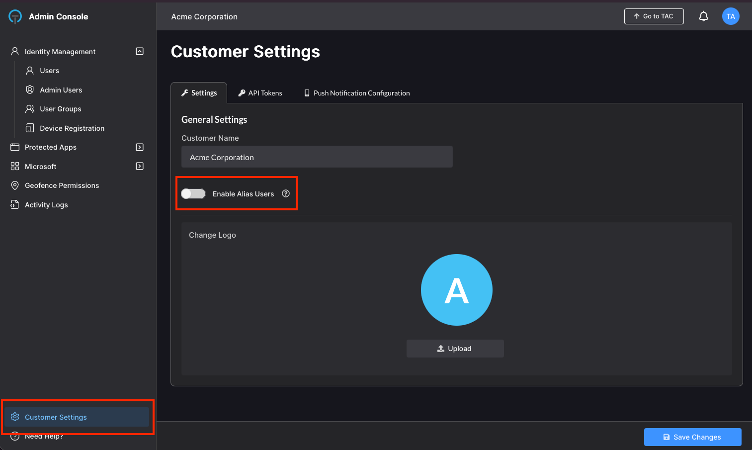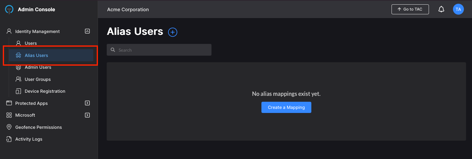In the TraitWare console, navigate to Customer Settings in the bottom left of the page. Select Enable Alias Users.