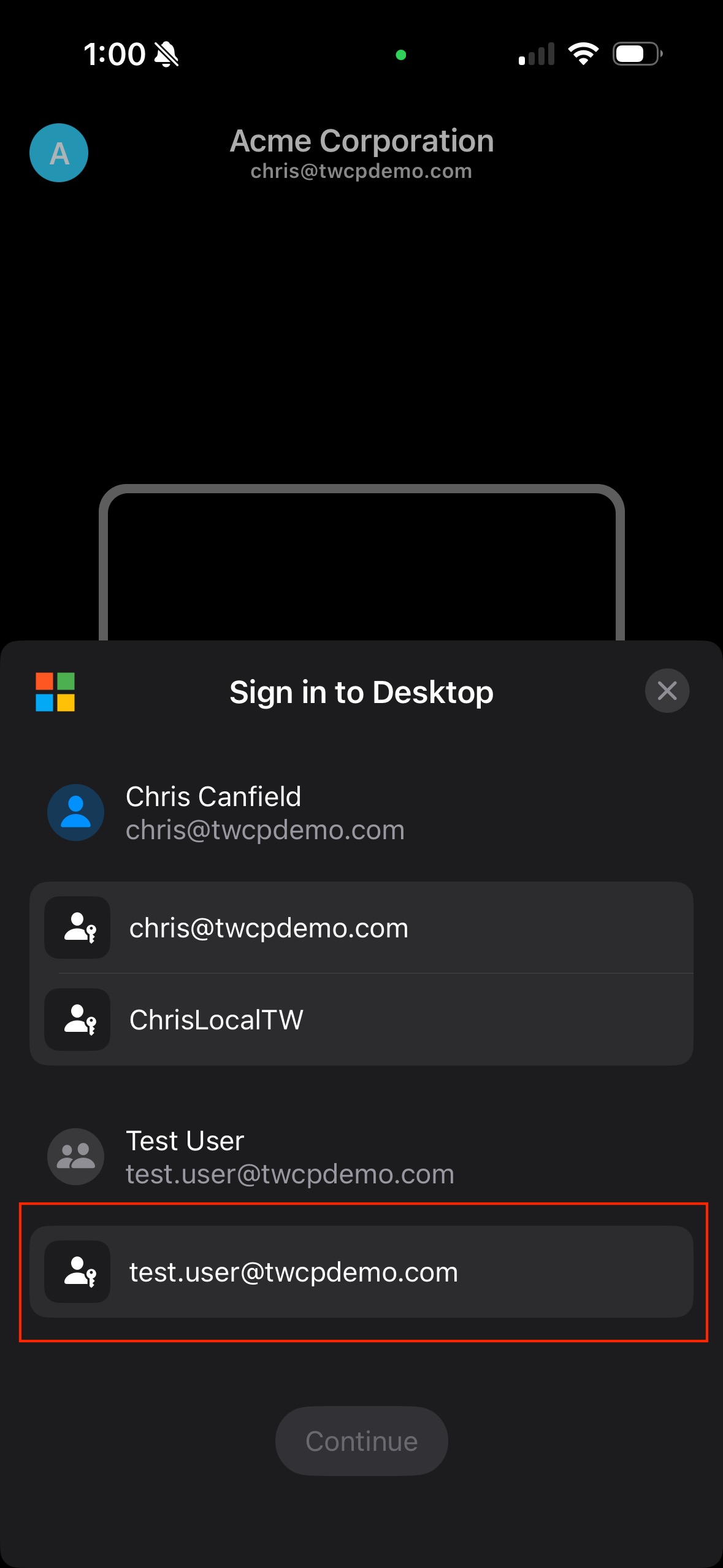 If alias users are available for the Windows endpoint, a list of available alias users appears. Tap the preferred alias user and click Continue.