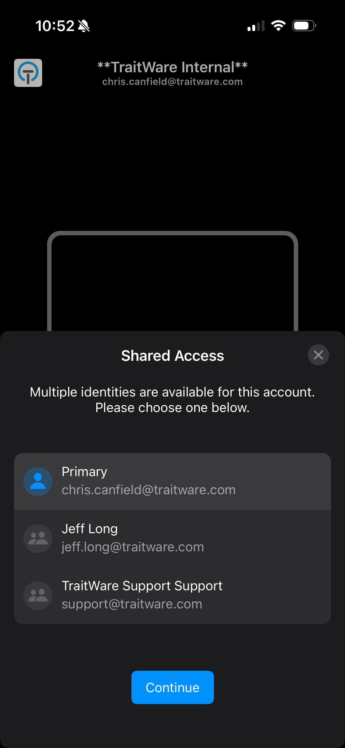 Select Continue and the the login will proceed. The user is logged in to the application as the Primary user.