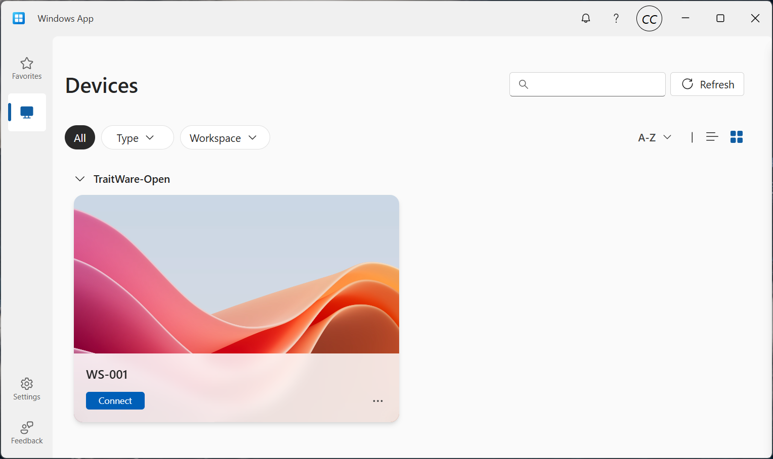 A dashboard of available devices for the user is displayed. Click Connect to connect to a device.